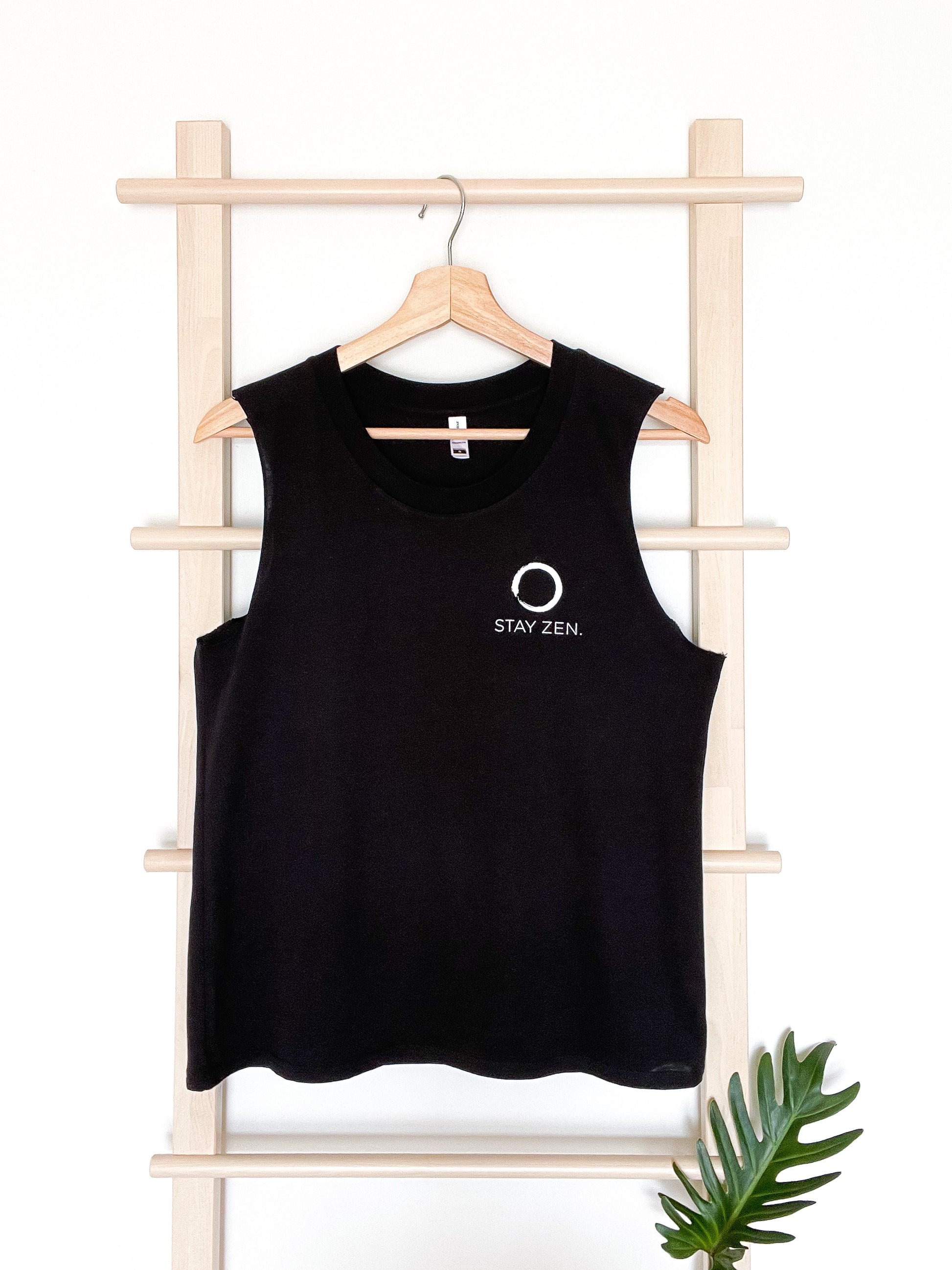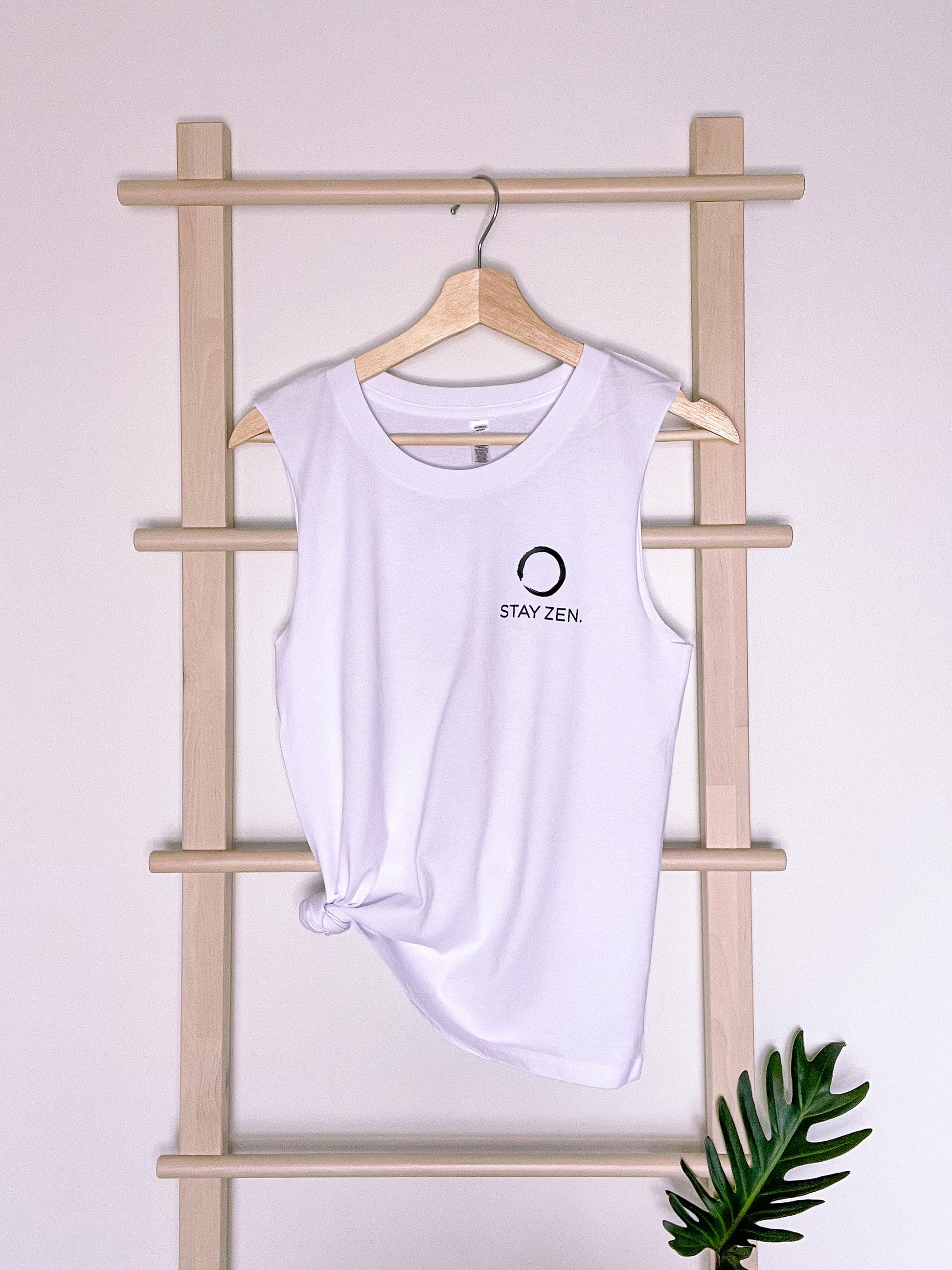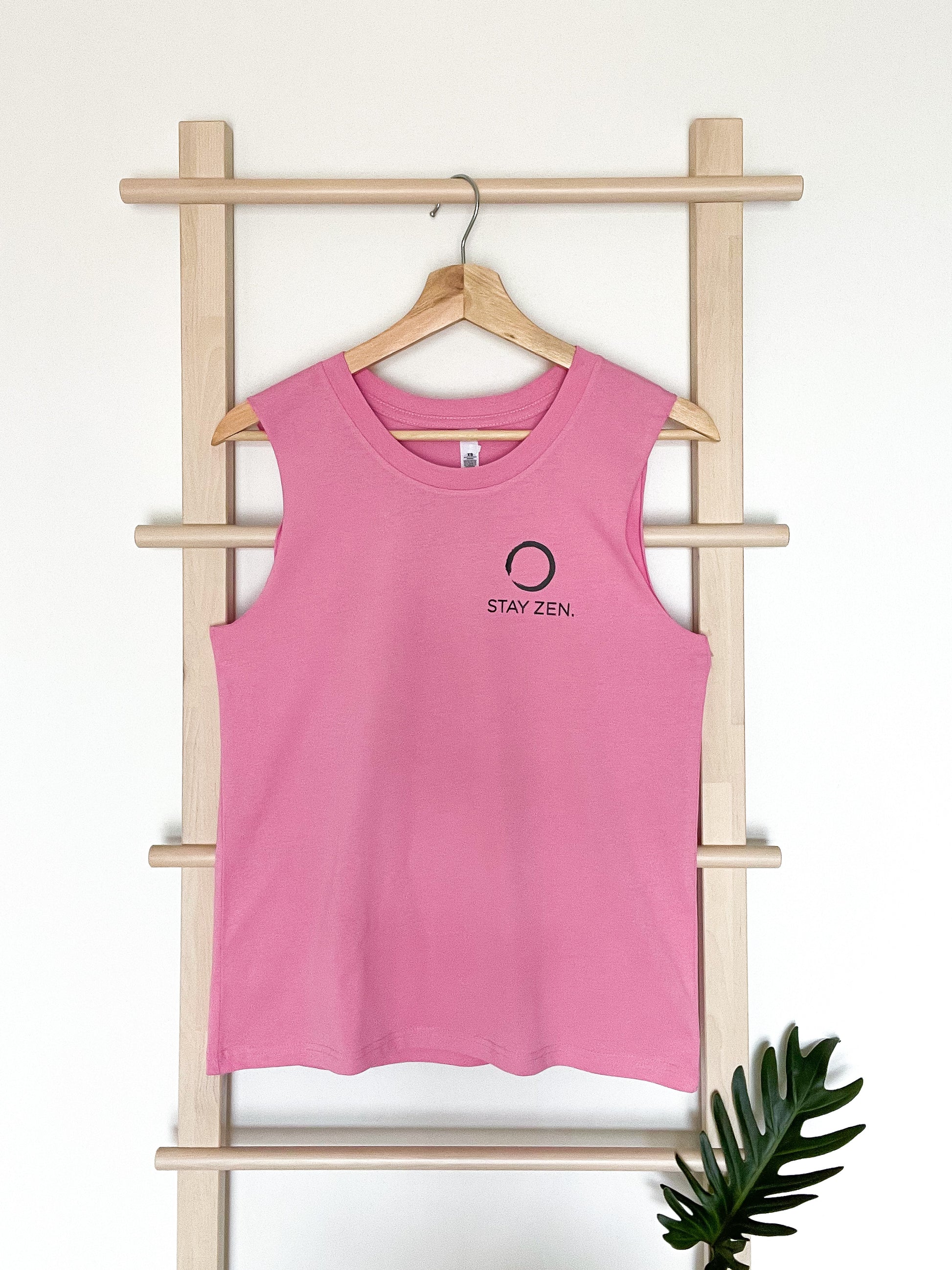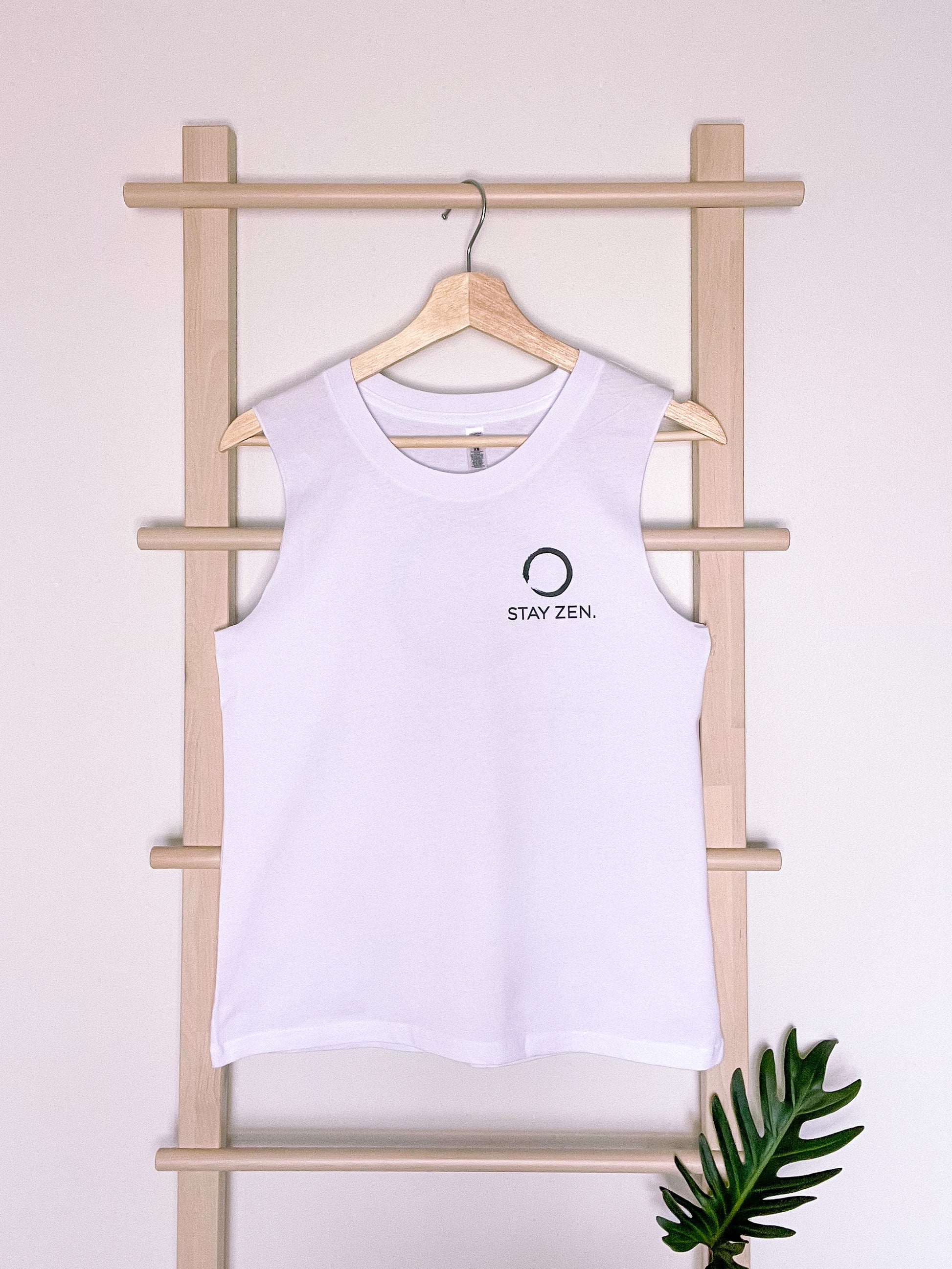 Sleeveless tank, raw armhole edges, neck ribbing, double needle hems, side seamed, preshrunk to minimise shrinkage