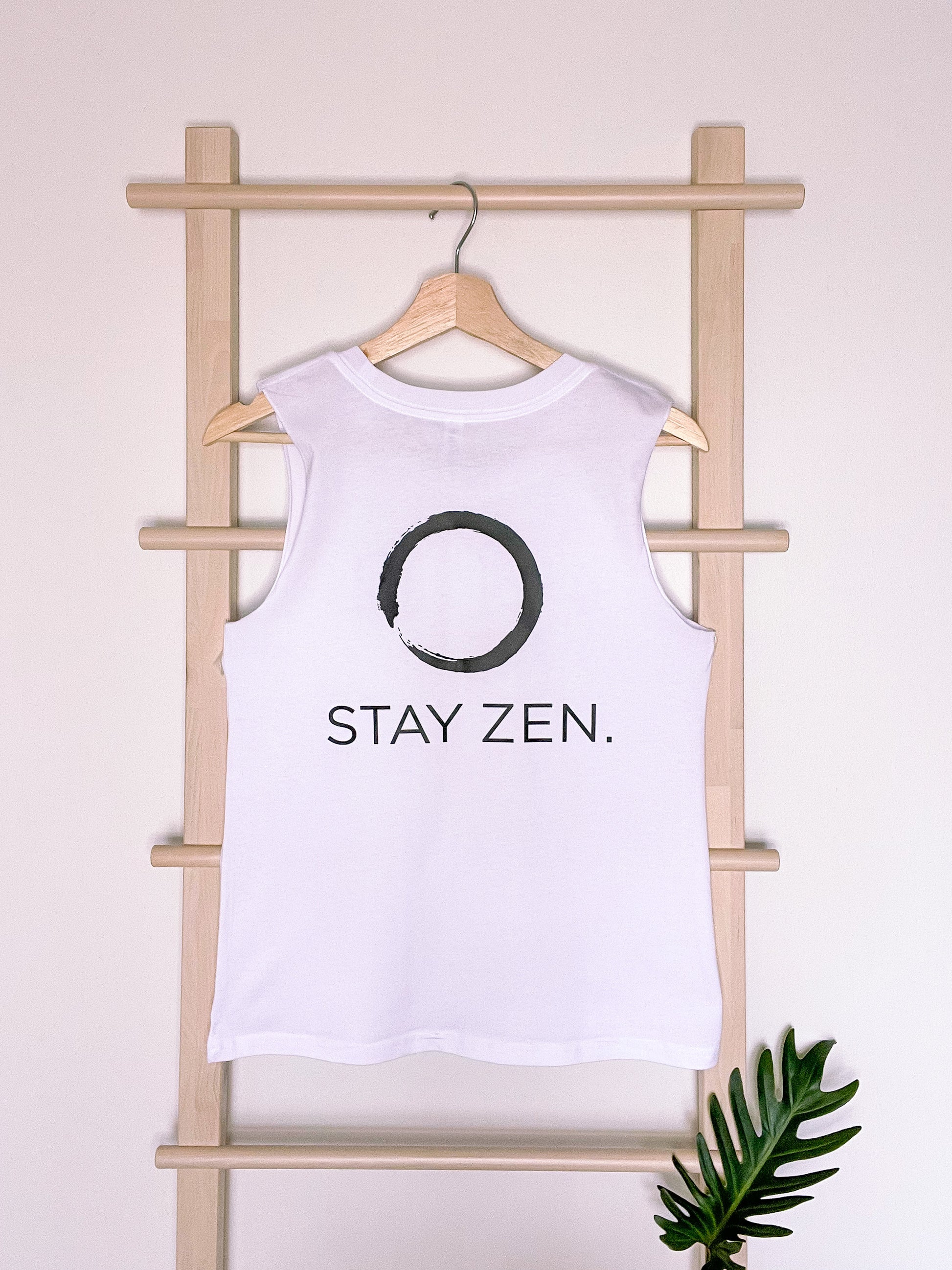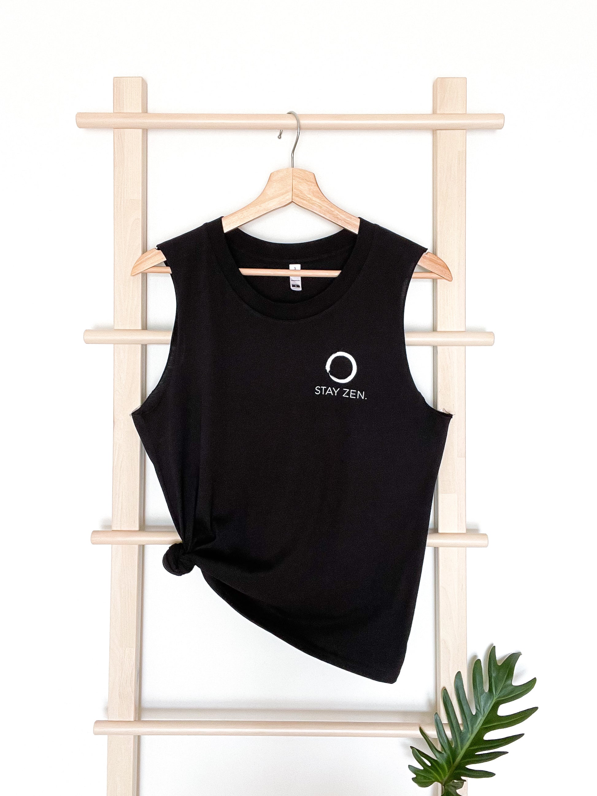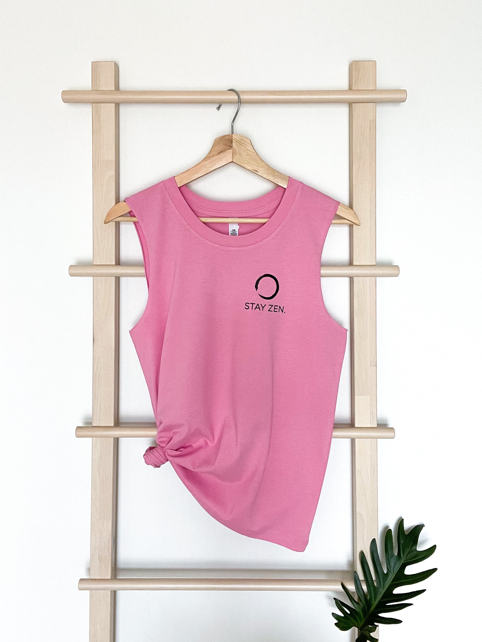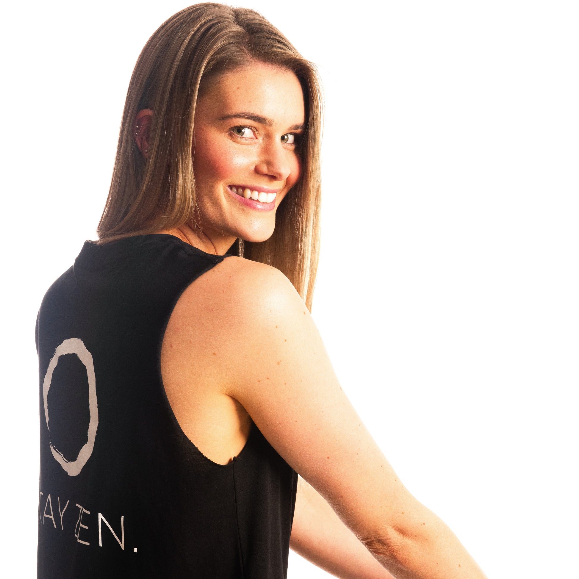 Sleeveless tank, raw armhole edges, neck ribbing, double needle hems, side seamed, preshrunk to minimise shrinkage